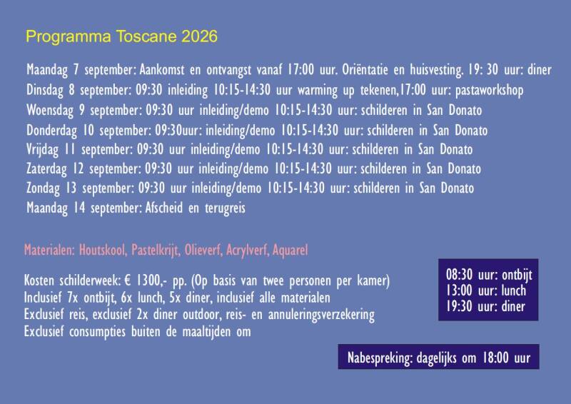- Bij annulering van de schilderweek wordt de aanbetaling niet gerestitueerd. Wel is het mogelijk om je plek over te dragen aan iemand anders.