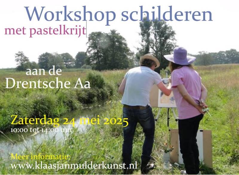 Op zaterdag 24 mei organiseer ik bij goed weer en bij voldoende deelname een workshop schilderen met pastelkrijt bij de Drentsche Aa. Locatie wordt nog nader bekendgemaakt. Aanvang: 10 uur. Schilderen tot 14:00 uur. Lunchpakket en eigen koffie/thee meenemen. Kosten: € 75 per deelnemer, inclusief doosje pastelkrijt, papier en MDF paneel. Voor een opklapbare schildersezel wordt gezorgd. Opgeven vóór 1 mei via klaasjan1964@gmail.com of 06-15310753